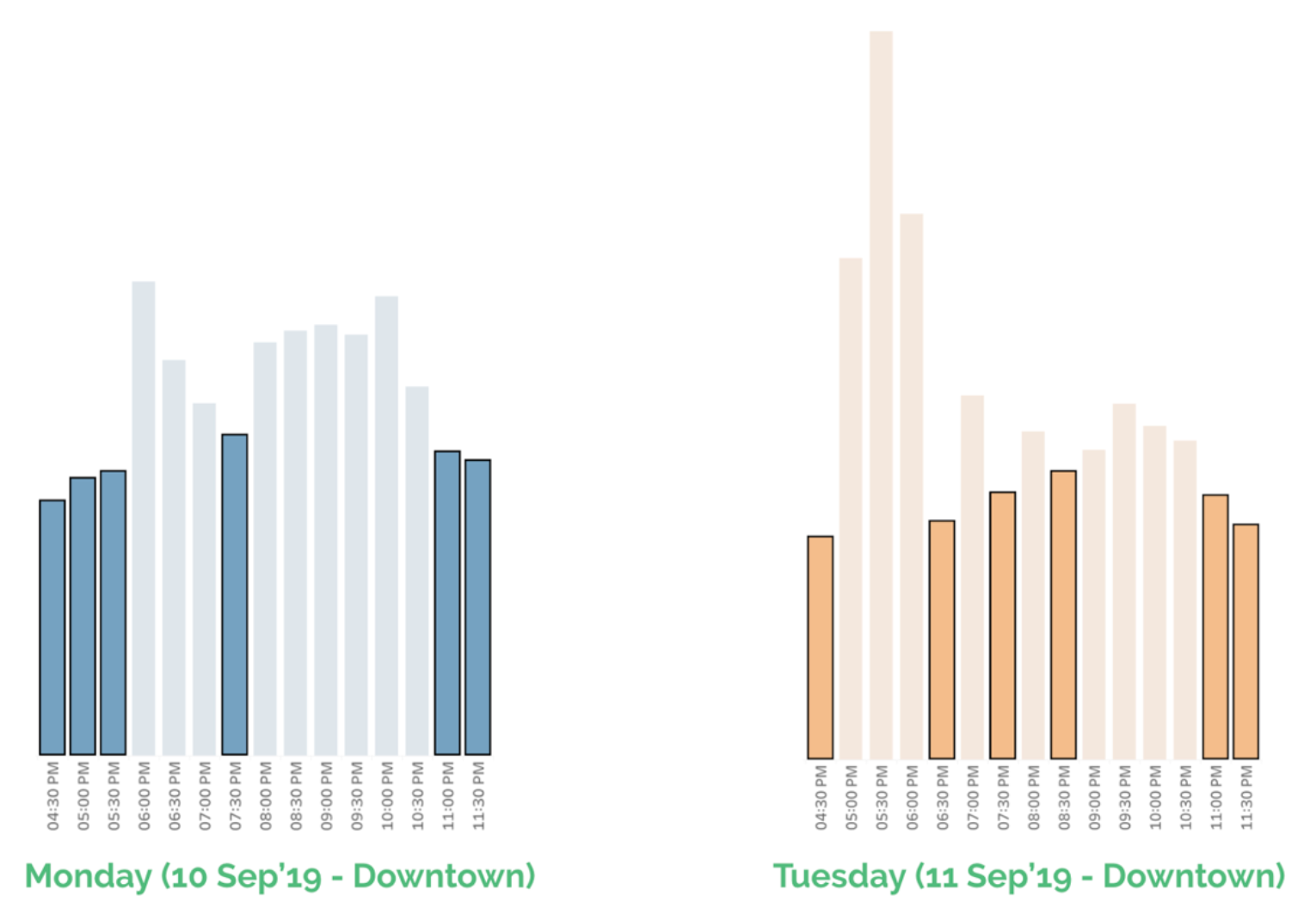 향후 2시간 동안의 수요의 수준을 보여줌으로써 그랩을 이용하는 고객들에게 시간을 위한 계획을 세울 수 있도록 도움을 주었습니다. 즉, 미래 수요에 대한 투명한 정보를 바탕으로 고객들이 미래 여정을 결정할 수 있도록 했습니다.