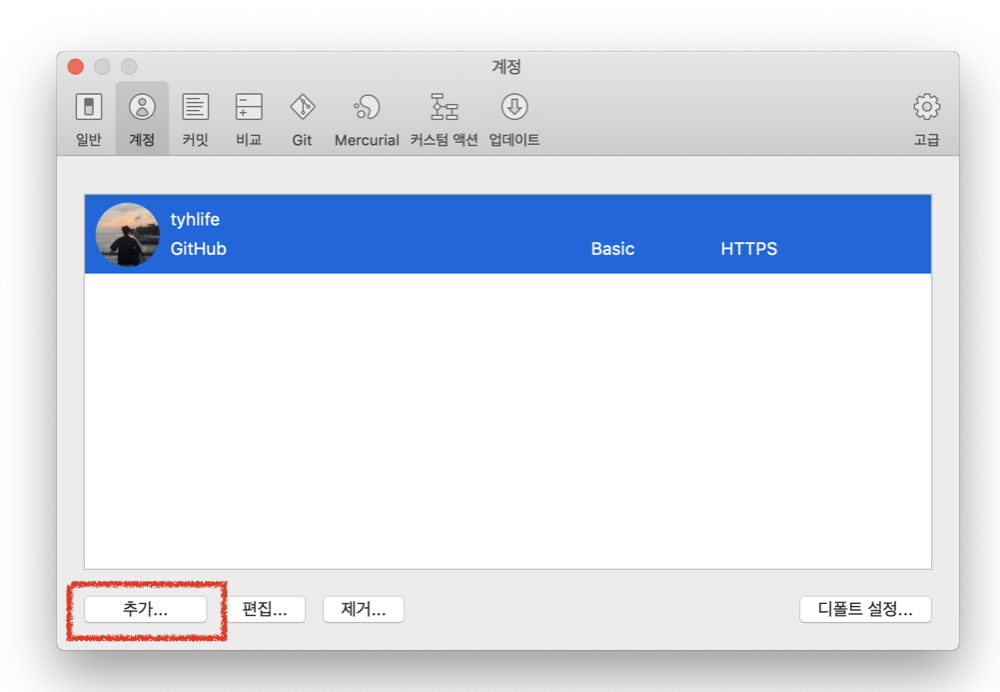 다음으로 [추가] 버튼을 눌러줍니다. 기존에 GitHub 계정이 연결된 상황에서 새로운 GitHub 계정을 연결하려고 합니다. 처음 계정을 연동하는 것과 과정은 똑같습니다.