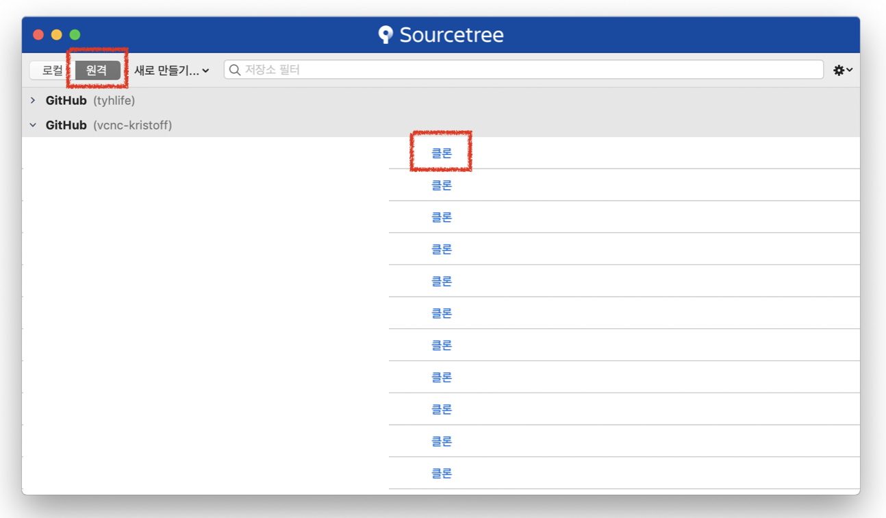이제 [원격] 버튼을 누르고 원하는 프로젝트를 clone하면 Sourcetree를 사용할 수 있습니다.