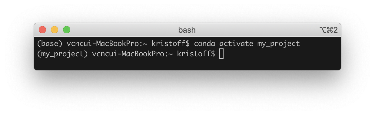- 아래의 명령어를 실행하고 나면 bash 창이 (project_name)에서 (base)로 돌아온 것을 확인할 수 있습니다.