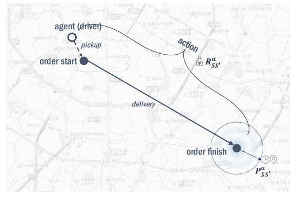 고전적인 배차 로직은 주문을 보낸 승객과 가장 가까운 곳에 있는 차량의 드라이버를 매칭 시켜주는 방식입니다. 하지만 디디추싱에서는 특정 지역에서 운전자가 얻을 수 있는 기대이익을 최대화 할 수 있는 배차를 수행하고 있습니다. 단순히 가장 가까운 곳에 있는 승객이 보낸 요청을 드라이버의 스마트폰 상에 띄워주는 것이 아니라, 장기적으로 봤을 때 이윤을 극대화 시킬 수 있는 매칭을 해주는 방식입니다. 이를 위해 디디추싱에서는 Reinforce Learning 의 바탕이 되는 Markov Decision Process을 사용했습니다.
