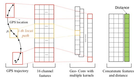 DeepTTE 에서는 이와 같은 단점을 보완하고자 Geo-Conv Layer 라는 방식을 사용했습니다. GPS Point로 부터 공간적인 패턴을 포착하기 위해 Conv Layer 를 사용했는데요. 앞서 설명한 데이터 표현 방식보다 더 정교한 공간 패턴 학습을 위해 GPS Point 들을 channel 이 16개인 1D-CNN 을 학습시켰습니다.