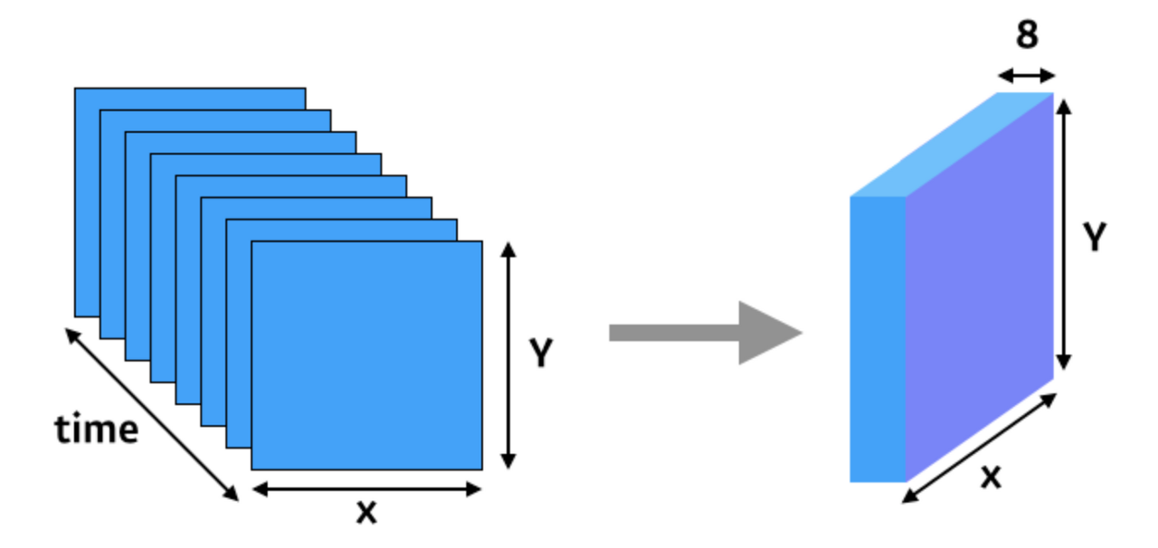 - 30분 동안의 이미지가 총 8장 겹쳐진 형태로 데이터를 표현 (8채널의 2D 이미지)