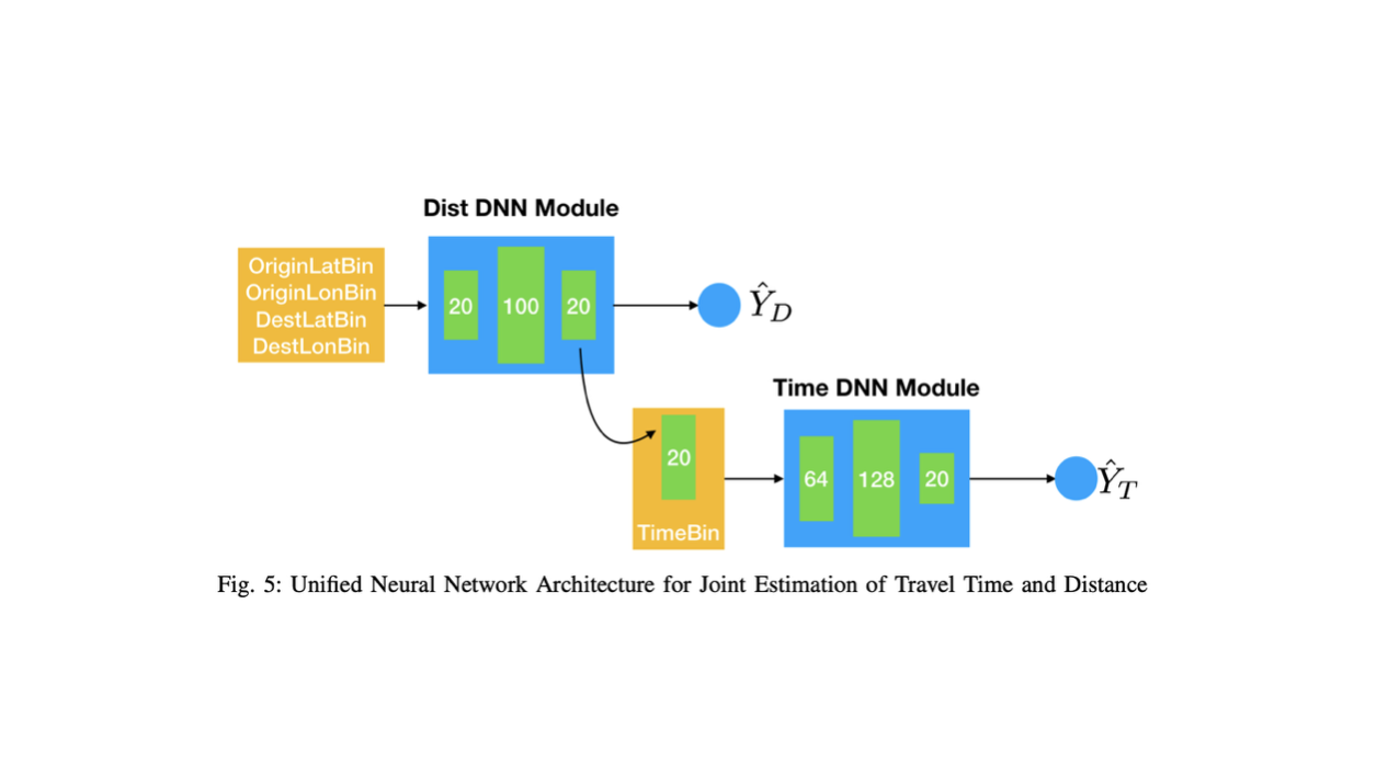 - 아래의 그림은 STNN의 아키텍처이다. 모델은 크게 이동 거리를 예측하는 Dist DNN Module과 이동 시간을 예측하는 부분인 Time DNN Module으로 구성되어 있다.