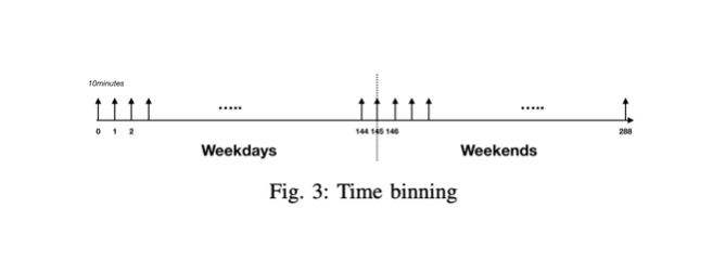 - 따라서 위의 144개의 시간셀을 주말과 평일을 구분하여 시간 데이터를 최종적으로 총 288개의 Time binning 데이터로 나타냈다.