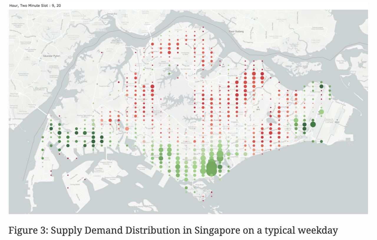 위에서 언급한 2가지 지표를 시각화 함으로서 수요 공급 차이와 과잉 수요 과잉 공급의 추세가 하루 종일 어떻게 변화하는지 쉽게 파악할 수 있습니다. 아래 GIF는 일반적인 평일에 싱가포르의 수요 공급 패턴을 보여줍니다.