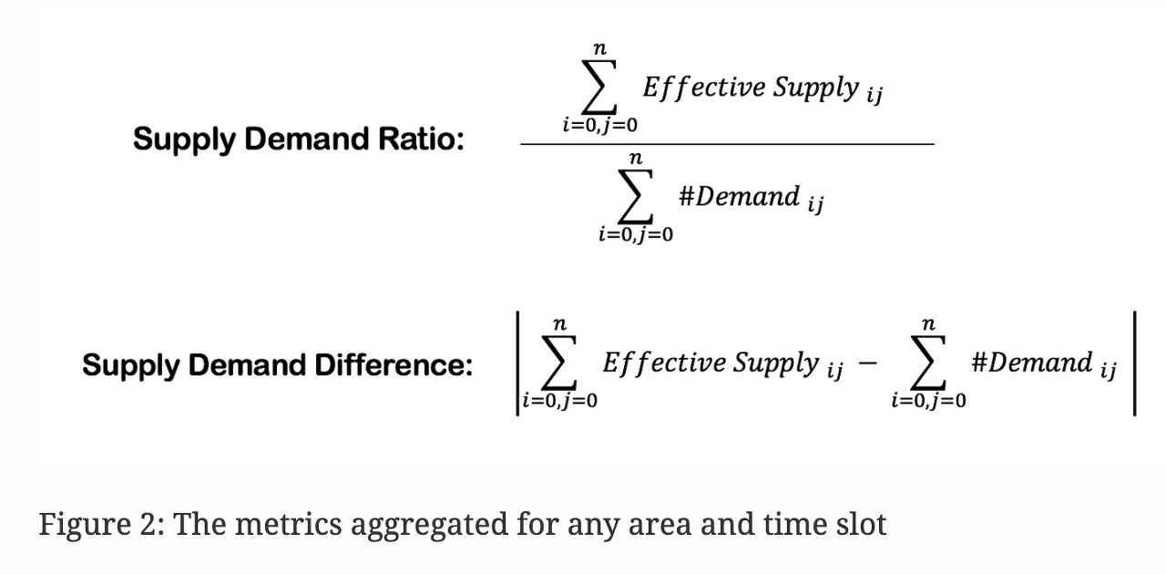 위의 방법을 통해 지도 상의 각각의 영역과 모든 time slot에 대해서 수요와 유효 공급을 집계할 수 있고 2가지 지표를 만들 수 있습니다. 수요 대비 공급(Supply Demand Ratio)와 수요 공급 차이(Supply Demand Difference)라는 2가지 지표를 만들 수 있습니다.