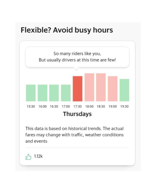 이러한 수요 공급의 불균형을 해결하기 위해 Grab은 위의 그림 처럼 승객의 앱에서 시간에 따른 수요 경향 위젯을 출시하여 승객에게 몇 시간 동안 예측된 수요 분포를 알려주고 있습니다. 이 위젯은 승객의 특정 위치에 대한 과거 데이터의 합계를 바탕으로 수요 추세를 보여줍니다. 이 위젯의 목표는 시간에 덜 민감한 수요(즉시 승차할 필요가 없는 승객)가 피크 타임을 피해서 호출할 수 있도록 유도하여 보다 시간에 민감한 긴급한 승객들이 보다 쉽게 공급을 할당받을 수 있도록 목표한 것 입니다.